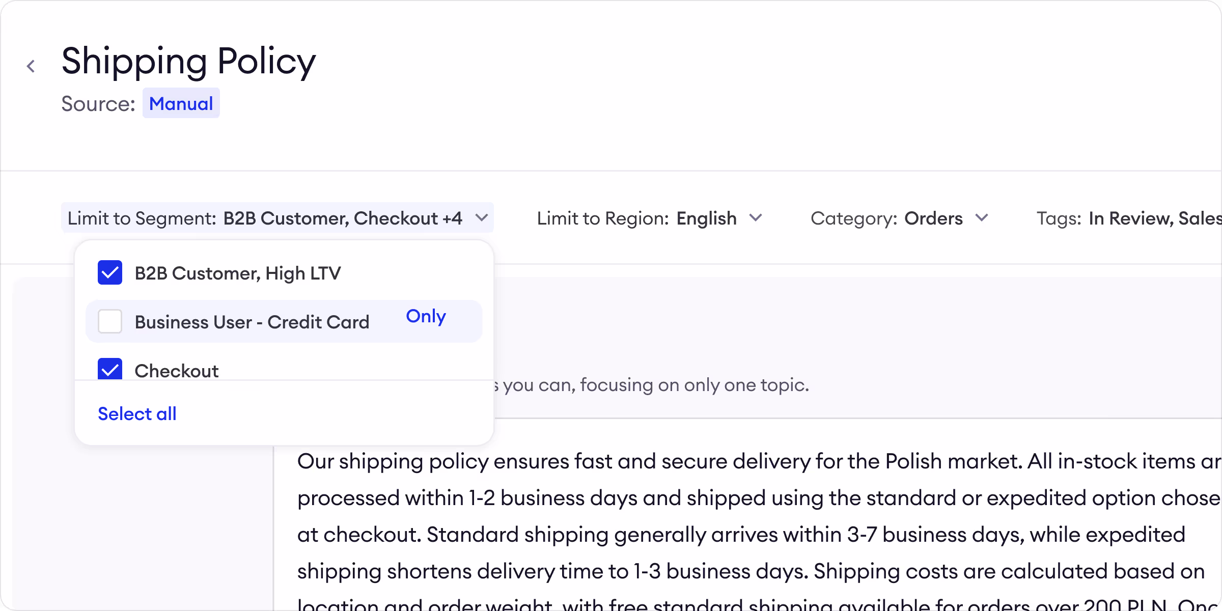 - Assign policies to specific segments and regions for targeted knowledge delivery