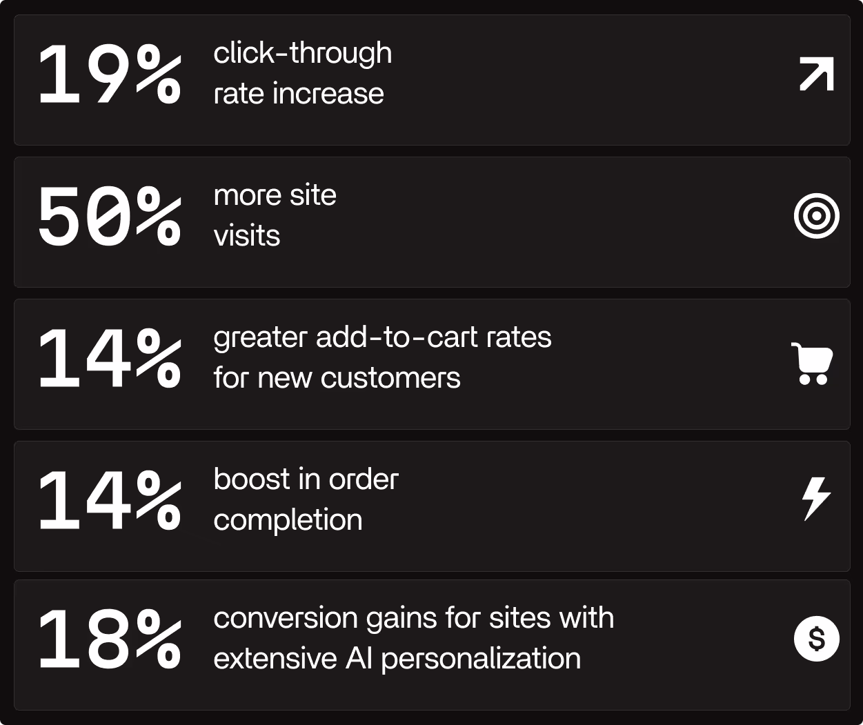 - 18% conversion gains for sites with extensive AI personalization, and 8% for those with minimal personalization.