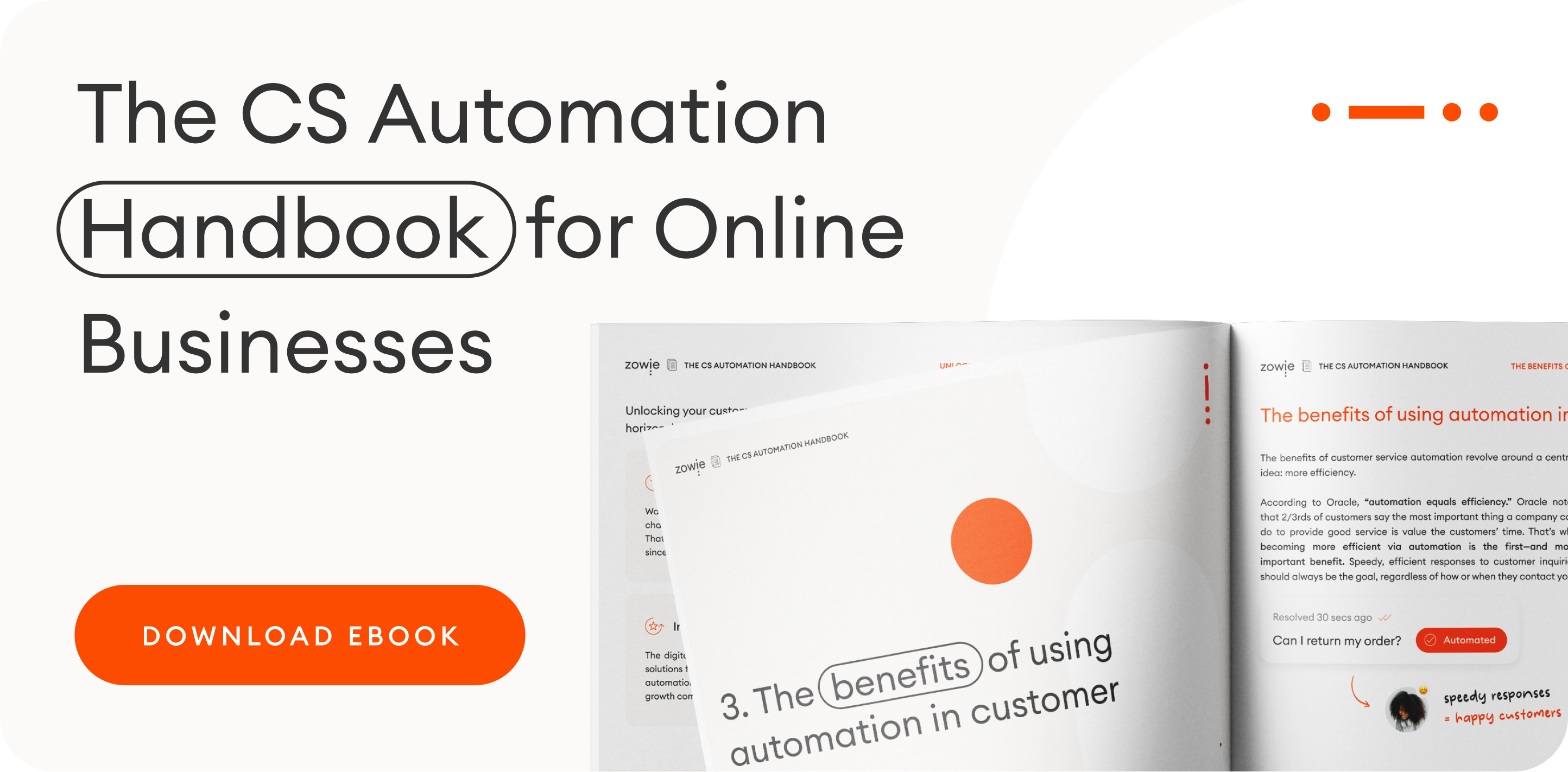 Below we’ll cover three of customer service automation’s most significant benefits. For a definitive guide to delivering exceptional online service, download Zowie’s ebook: The Customer Service Automation Handbook for Online Businesses.