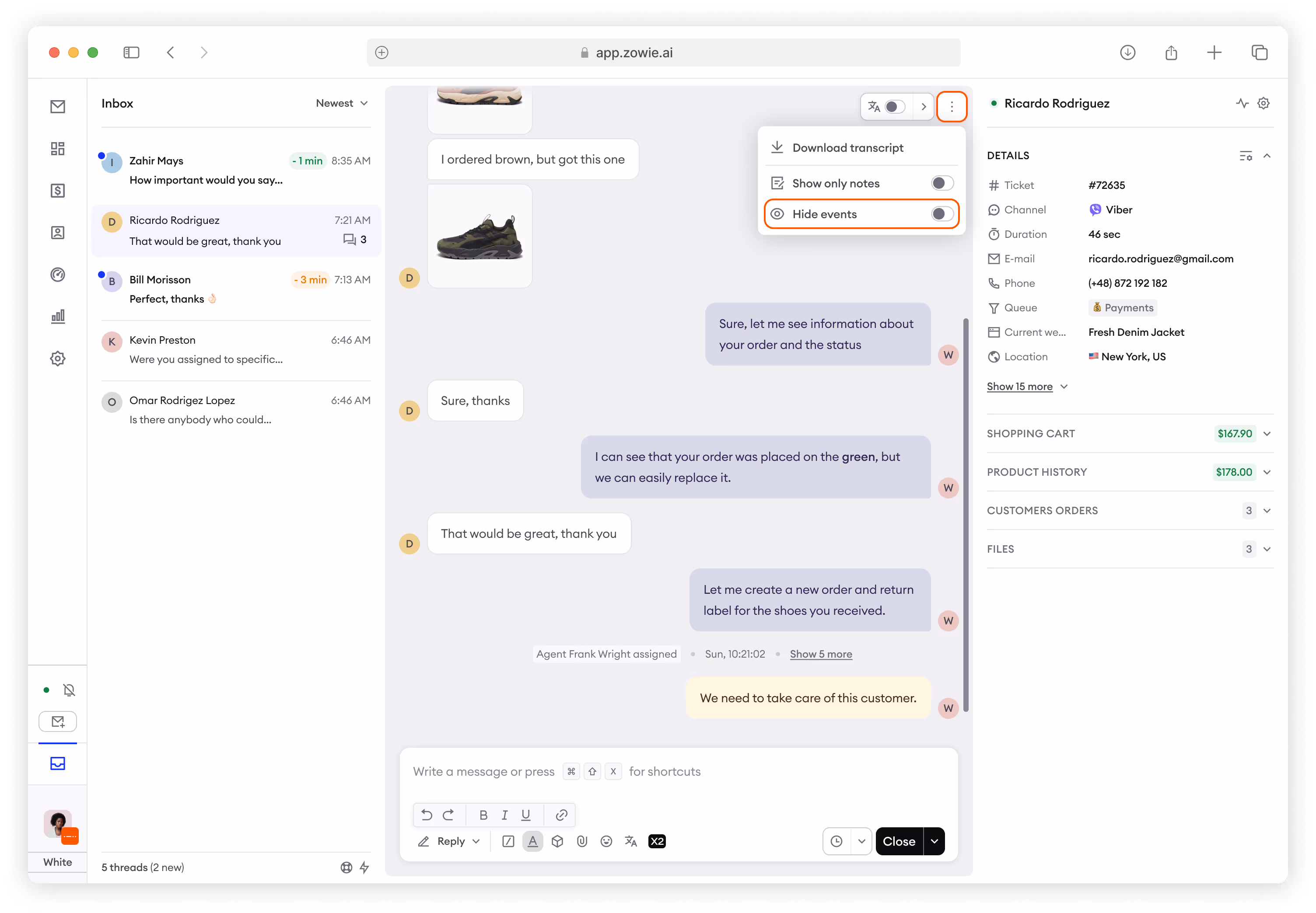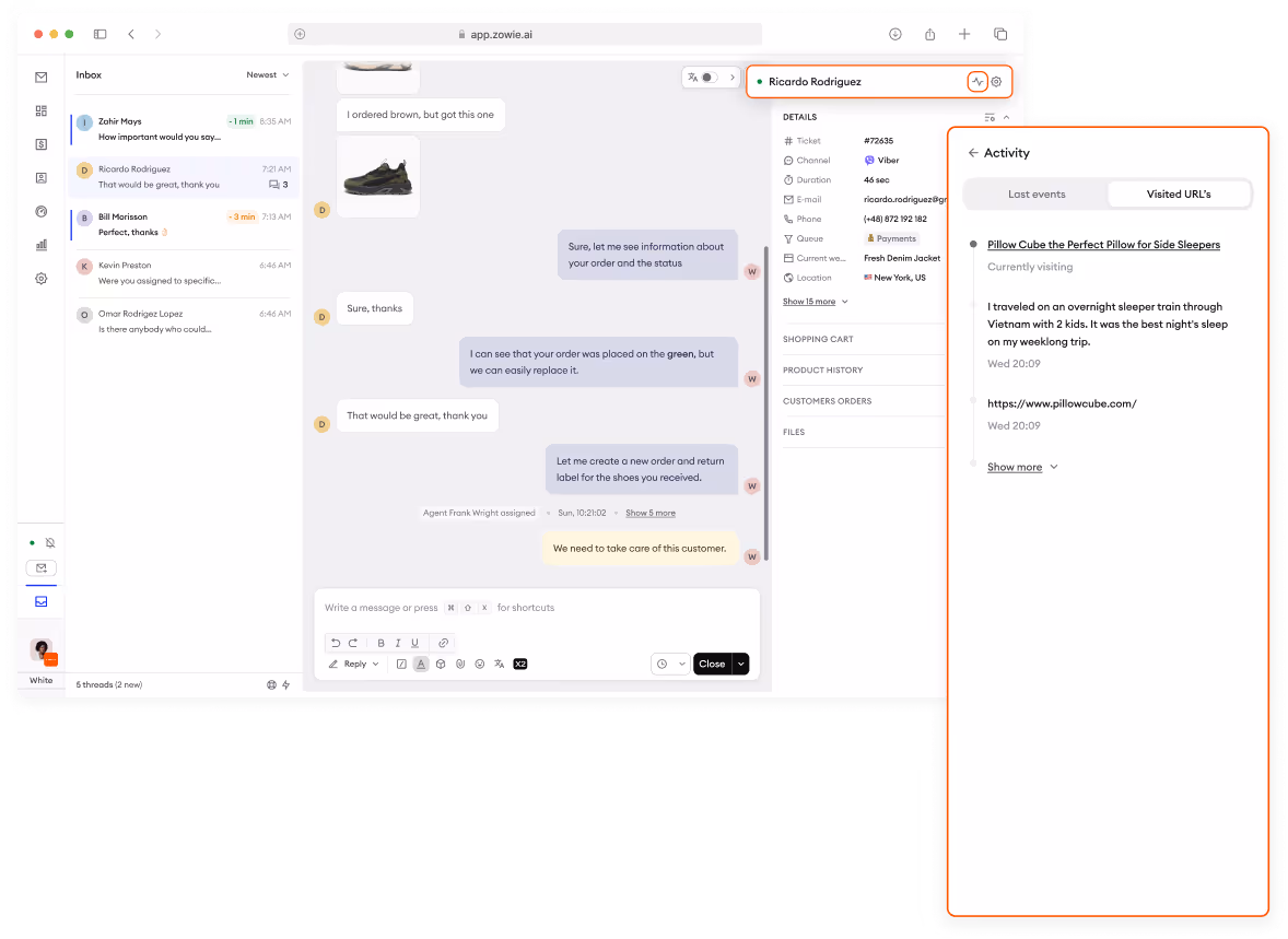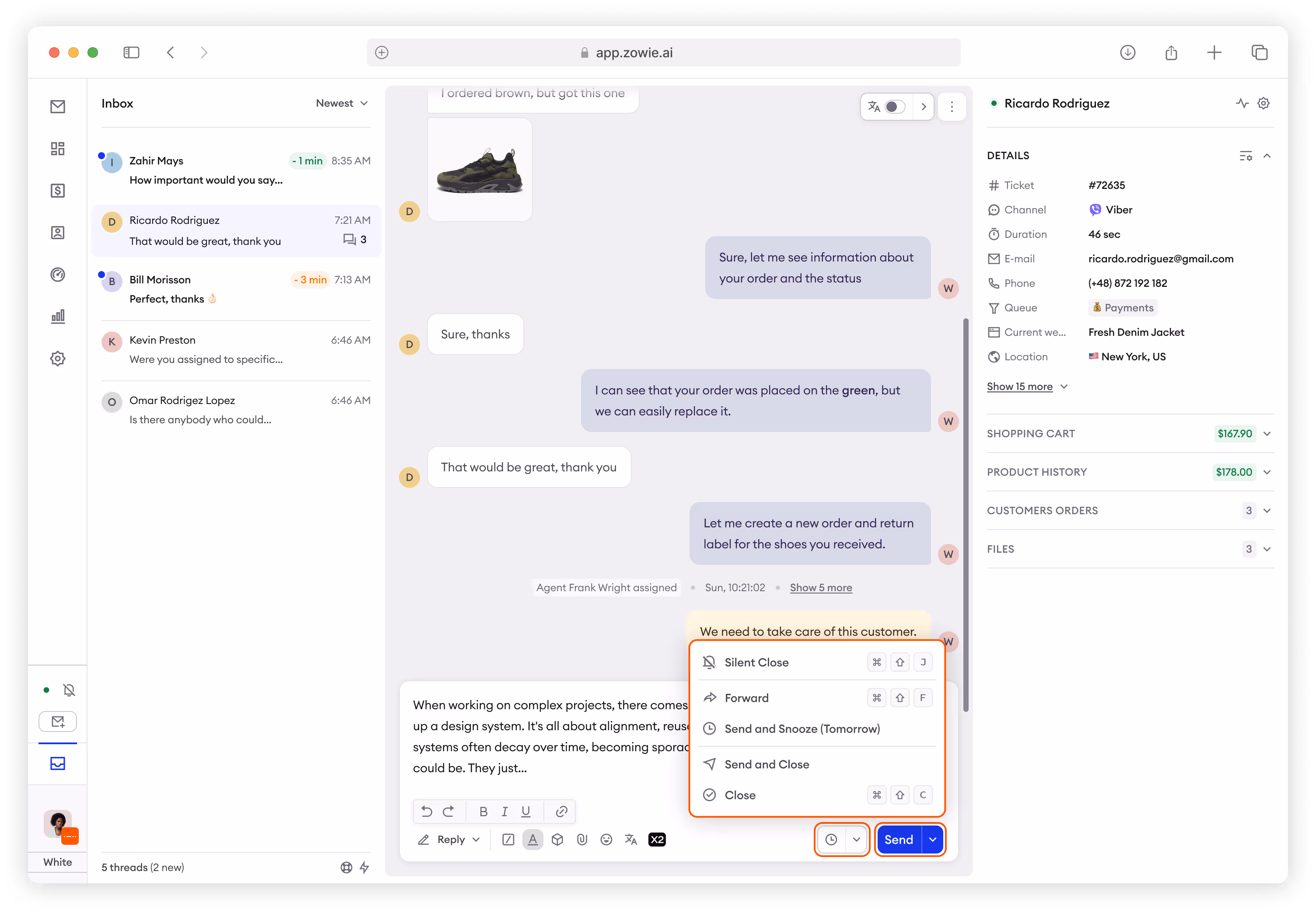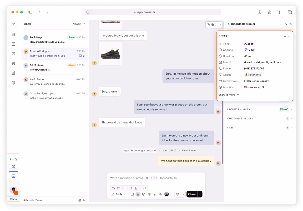 Agents interact with all kinds of customers and cases — consistently striking the right note can be quite the challenge. Inbox 2.0 does the heavy lifting, giving support reps the resources to quickly deliver on-brand replies that suit each customer’s unique needs. With customer details, auto-assignment features, and generative AI writing assistance available in one convenient location, agents are fully equipped to give every ticket the human touch with one click.