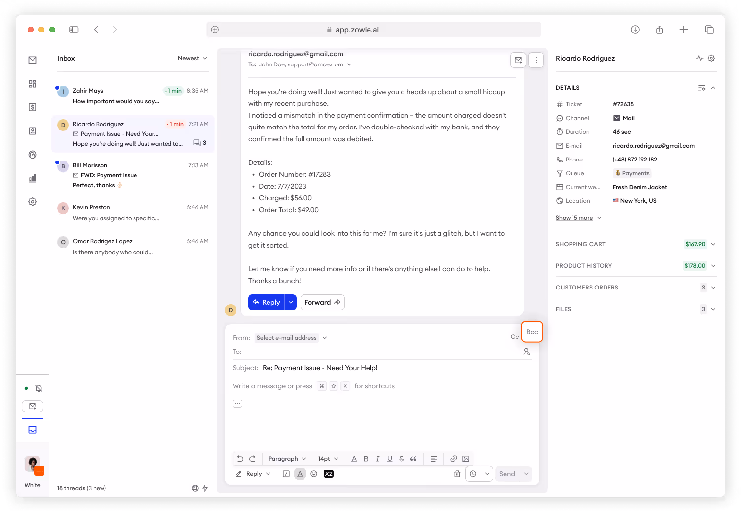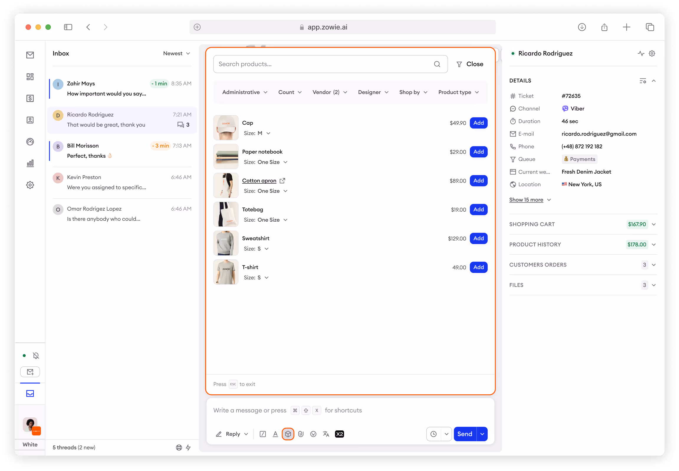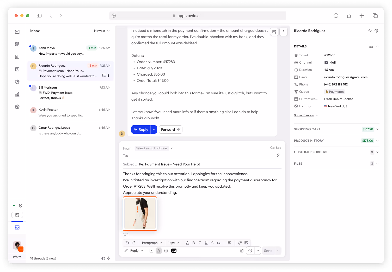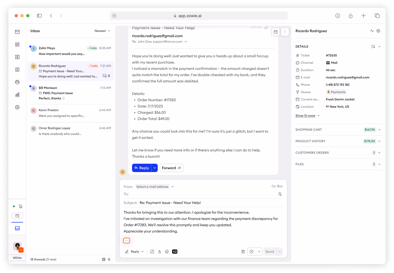 Agents interact with all kinds of customers and cases — consistently striking the right note can be quite the challenge. Inbox 2.0 does the heavy lifting, giving support reps the resources to quickly deliver on-brand replies that suit each customer’s unique needs. With customer details, auto-assignment features, and generative AI writing assistance available in one convenient location, agents are fully equipped to give every ticket the human touch with one click.