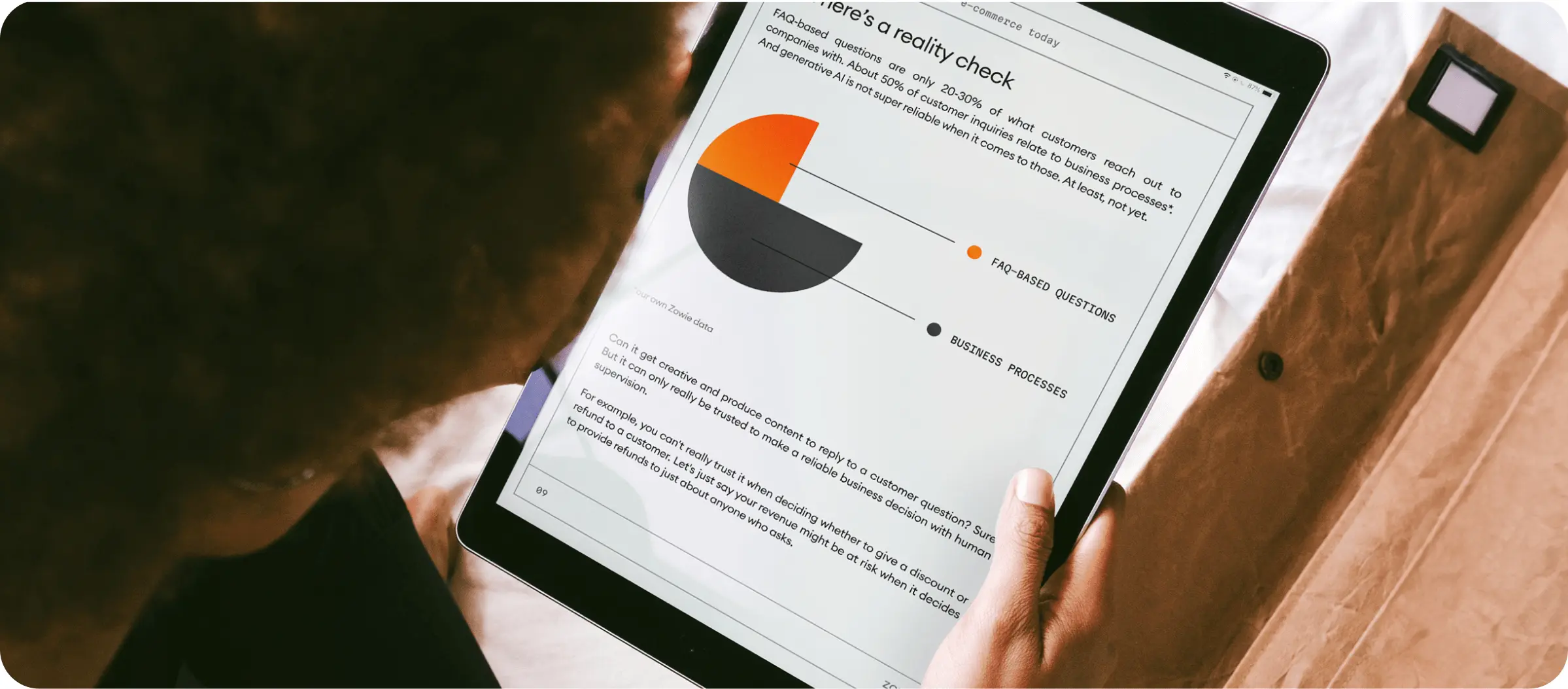 But there’s more to it than just putting up a chatbot on your website that serves people scripted answers to FAQs from your knowledge base. Our data shows that only 20-30% of customer inquiries are, in fact, FAQs. The rest often relates to business processes – and no generative AI is ready (yet) to take responsibility for those.