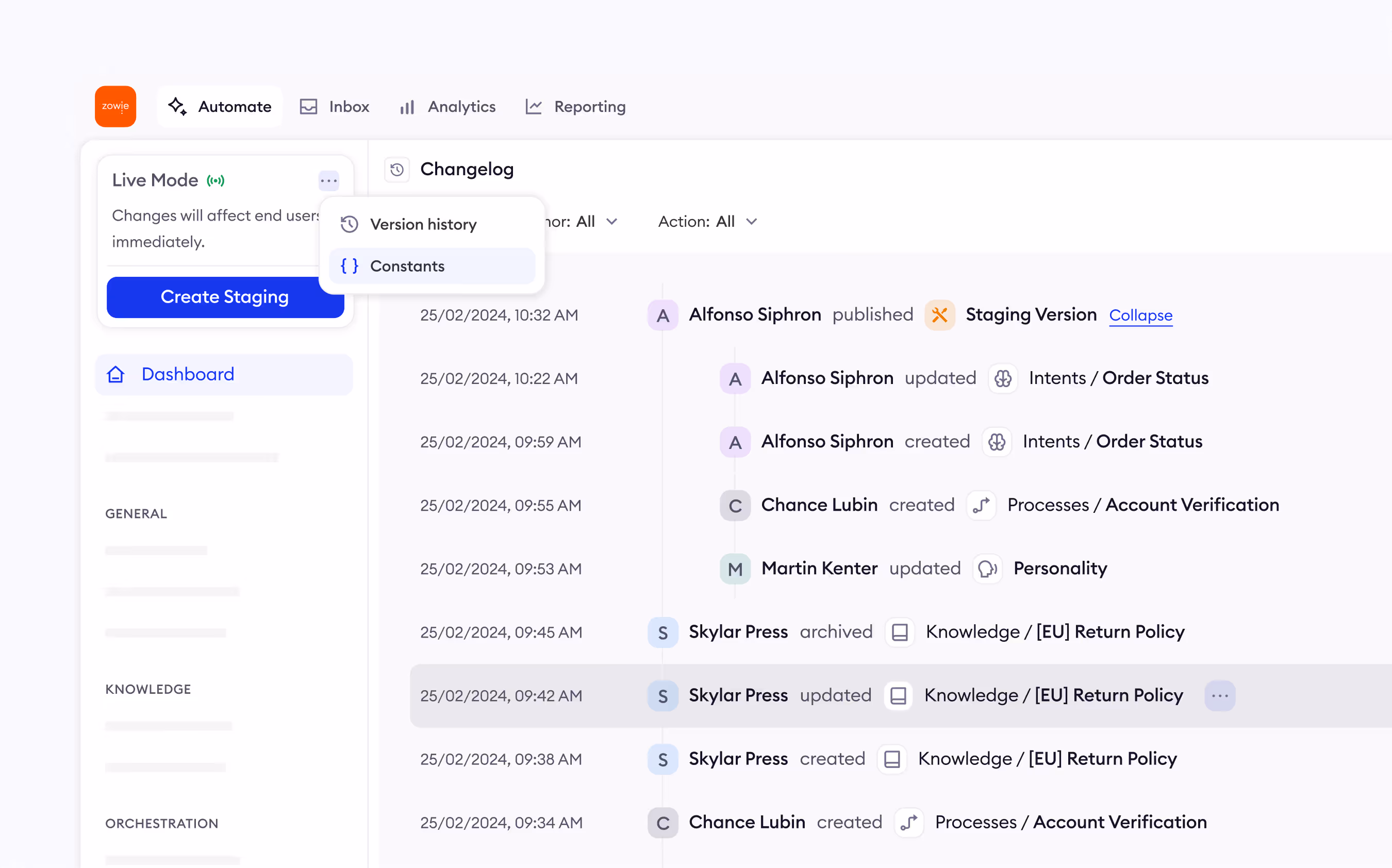Route between Zowie AI Agents, human agents, external AI agents, and in-house bots.