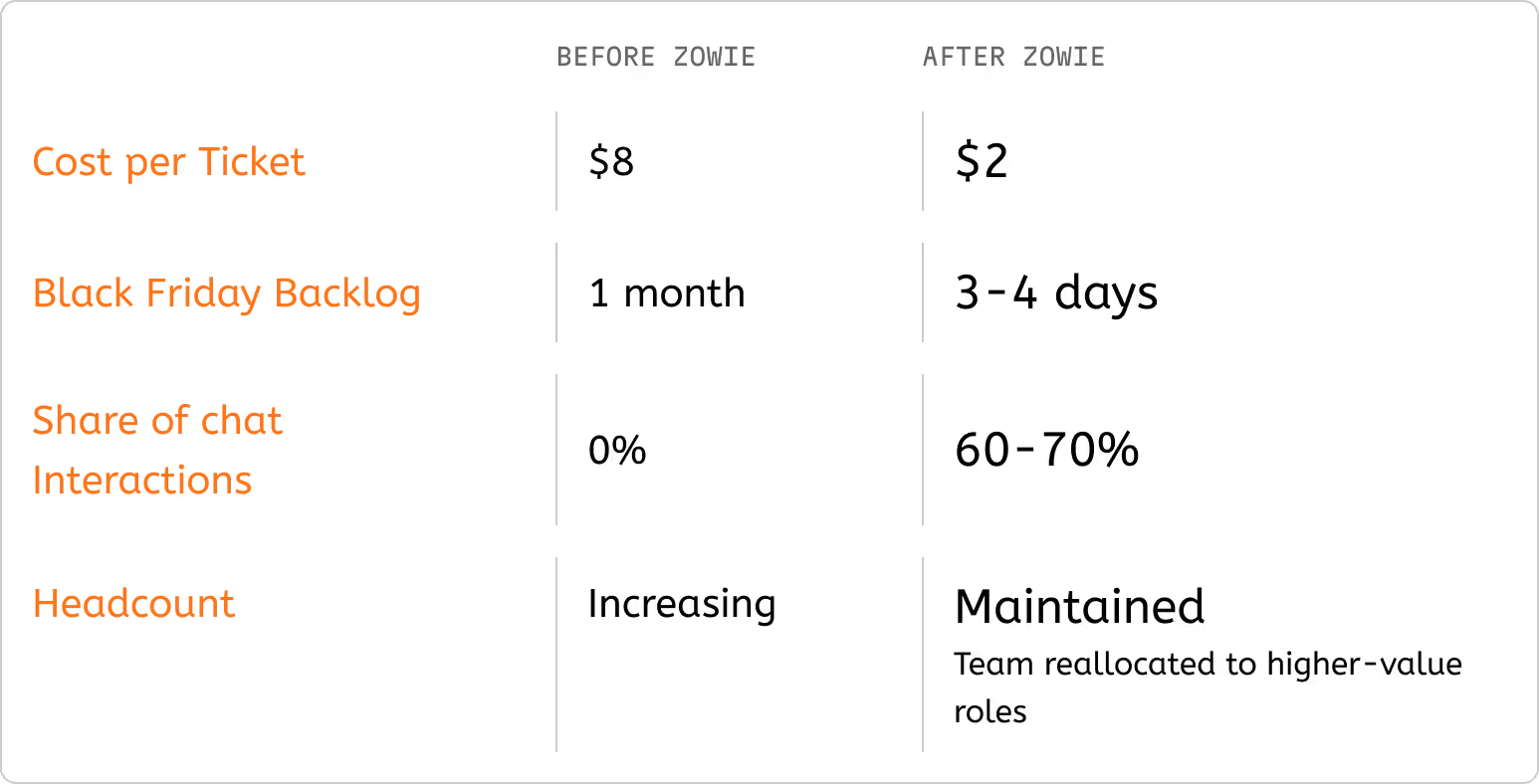 “Most platforms charge per seat, keep AI training behind closed doors, and limit access. Zowie does the opposite — they charge per automation, and they show us exactly how the AI works. Their incentives are aligned with ours — they only succeed if we succeed.”