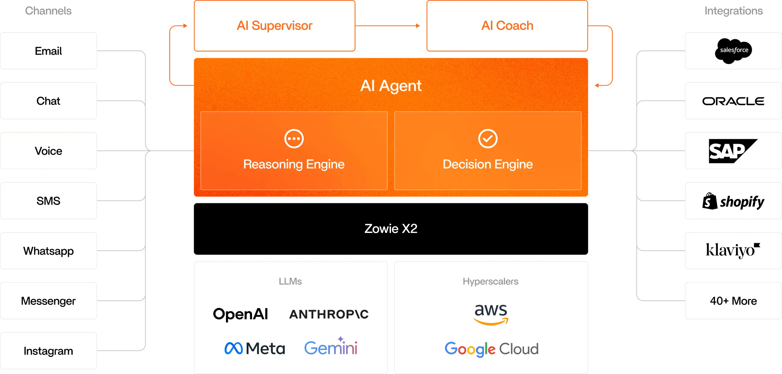 Connect to every system and every channel—email, chat, voice, social, and more. Zowie plugs into your tech stack, pulling context and pushing actions seamlessly across your customer journey.